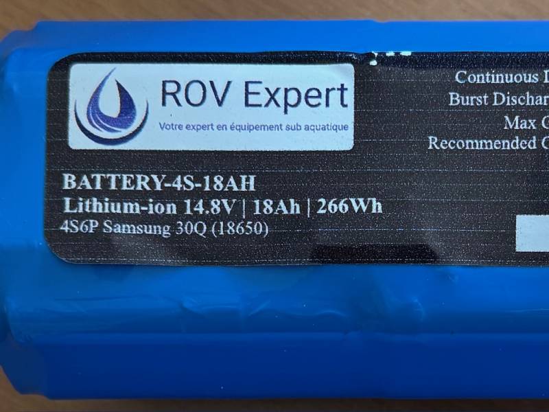 L'autonomie a été augmenté en remplaçant la batterie d'origine par 2 batteries 4S de 18Ah en provenance de notre partenaire ROV Expert. L'éclairage a été doublé par l'ajout de 4 projecteurs supplémentaires, 2 ? l'avant et 2 ? l'arri?re sur le skid.